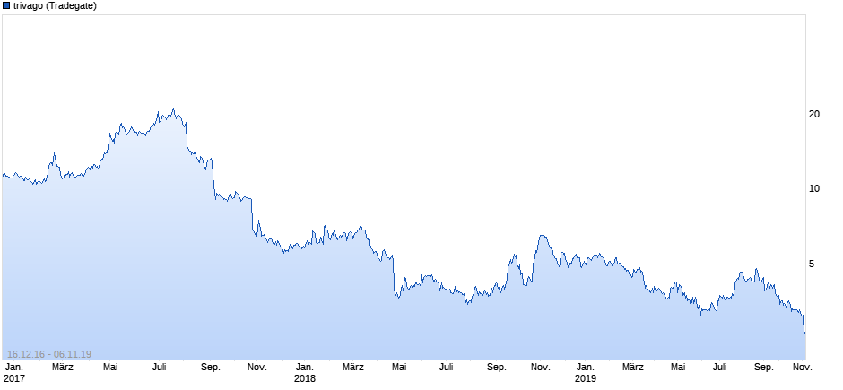 Trivago schreibt zwar seit einem Jahr schwarze Zahlen, dennoch bleibt der Kapitalmarkt skeptisch. Die gestern vorgelegten Zahlen zum 3. Quartal 2019 enttäuschten die Anleger ebenfalls: Der Umsatz mit rund 250 Millionen Euro stagnierte verglichen mit dem Vorjahr faktisch. Der Gewinn brach sogar massiv ein, von rund 10 Millionen Euro im 3. Quartal 2018 auf 300.000 Euro im 3. Quartal 2019.